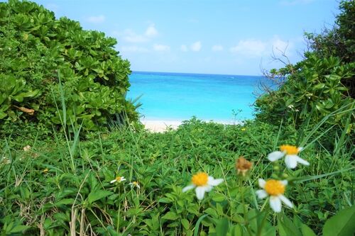 海辺の外周道路をひたすら自転車で駆け抜け、やって来たのは奄美1番の美しいビーチといわれる百合が浜。 9月の中旬とあって我々一行で貸し切りです。 珊瑚礁の遠浅の海とあって、環礁の先端がはるか遠くに。干潮になったら巨大な白砂の島が出現するそうで…